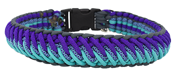 Paracord Color: Gun Metal Grey (outside edge); Acid Purple, Turquoise with Acid Purple Diamonds, & Turquoise (top weave)